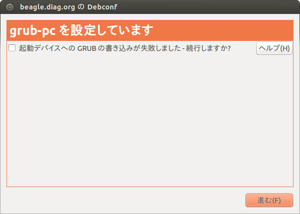 途中で、「起動デバイスへの GRUB の書き込みが失敗しました。続行しますか?」と出てくる。